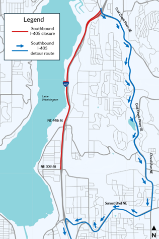 Southbound I-405 will be closed from Coal Creek Parkway Southeast to Northeast 30th Street from 11 p.m. Friday, Oct. 10 to 4 a.m. Monday, Oct. 13 to install drainage, pave and shift traffic to create a new center work zone as part of the I-405/Renton to Bellevue Widening and Express Toll Lanes Project. A signed detour route will be in place.